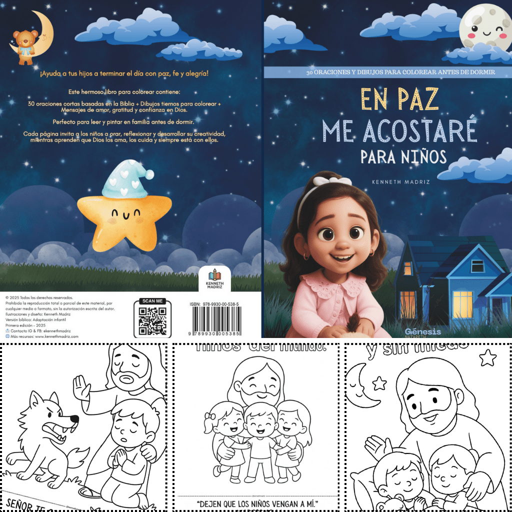 ¡Ayuda a tus hijos a terminar el día con paz, fe y alegría! Este hermoso libro para colorear contiene: 30 oraciones cortas basadas en la Biblia + Dibujos tiernos para colorear + Mensajes de amor, gratitud y confianza en Dios. Es perfecto para leer y pintar en familia antes de dormir. Cada página invita a los niños a orar, reflexionar y desarrollar su creatividad, mientras aprenden que Dios los ama, los cuida y siempre está con ellos.